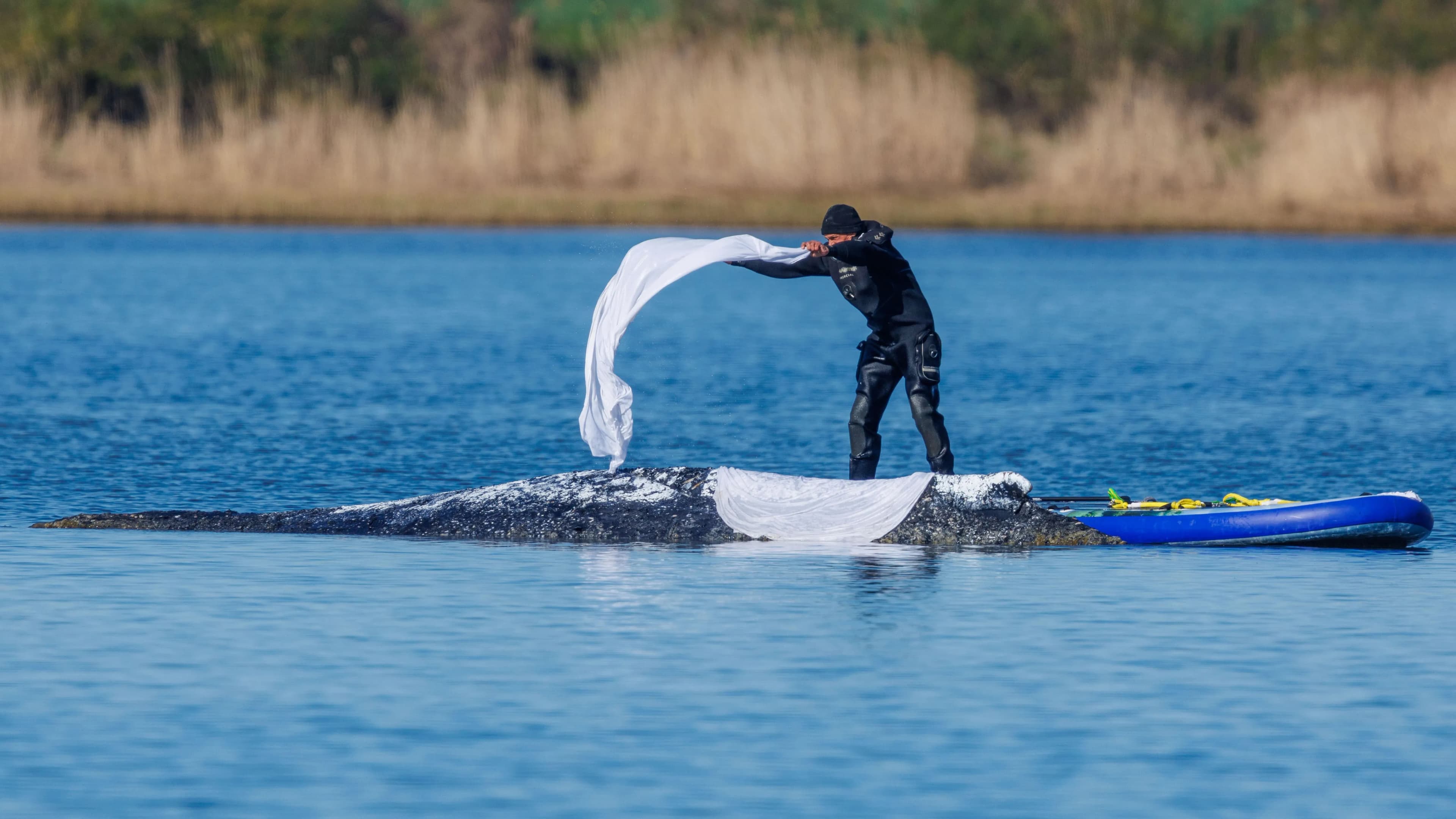 Wal Timmy macht Niedrigwasser zu schaffen – neue Sandsack-Idee